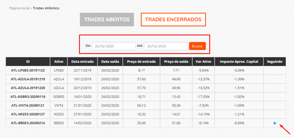 Por fim, após a página ser carregada você deve colocar o período que deseja realizar a consulta (no campo de data), clicar no botão buscar e esperar a tabela ser carregada. Os trades que você estava seguindo e que foram encerrados vão aparecer com uma estrela na coluna “Seguindo”.